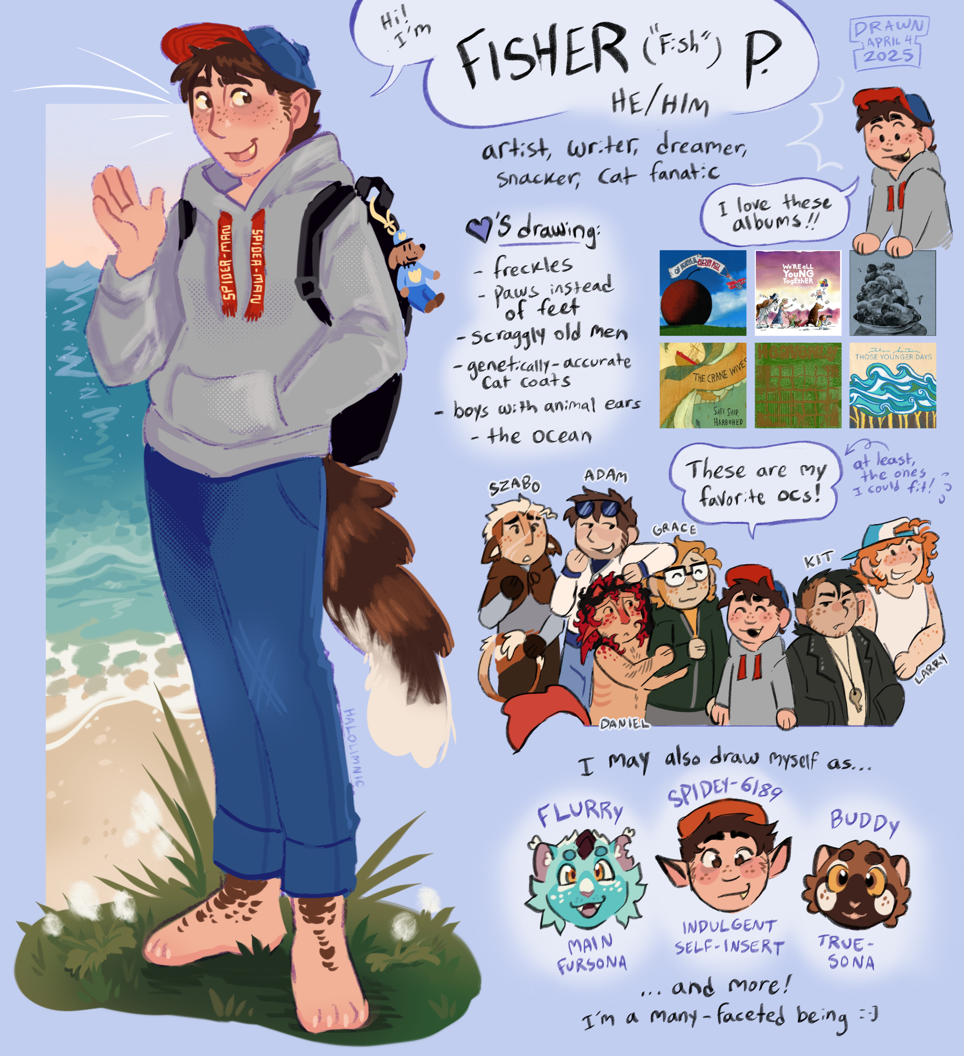 My conception of "the self" has always been somewhat fuzzy (both in the sense of being unclear, and being literally furry hahaha)... I've only recently taken to drawing myself more humanoid, so these are pretty varied! Any creature drawings here are an unfiltered & honest depiction of myself in the same vein as the human ones :-3